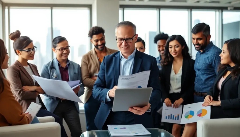diverse team discussing FHA loans in a modern office.